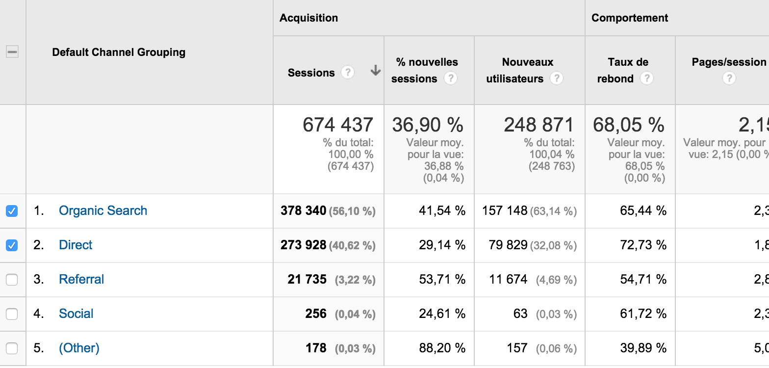 A côté, vous avez des métriques qui vous permettent d’analyser ces segments : durée de visites, pages par sessions, taux de rebond, conversions, etc.